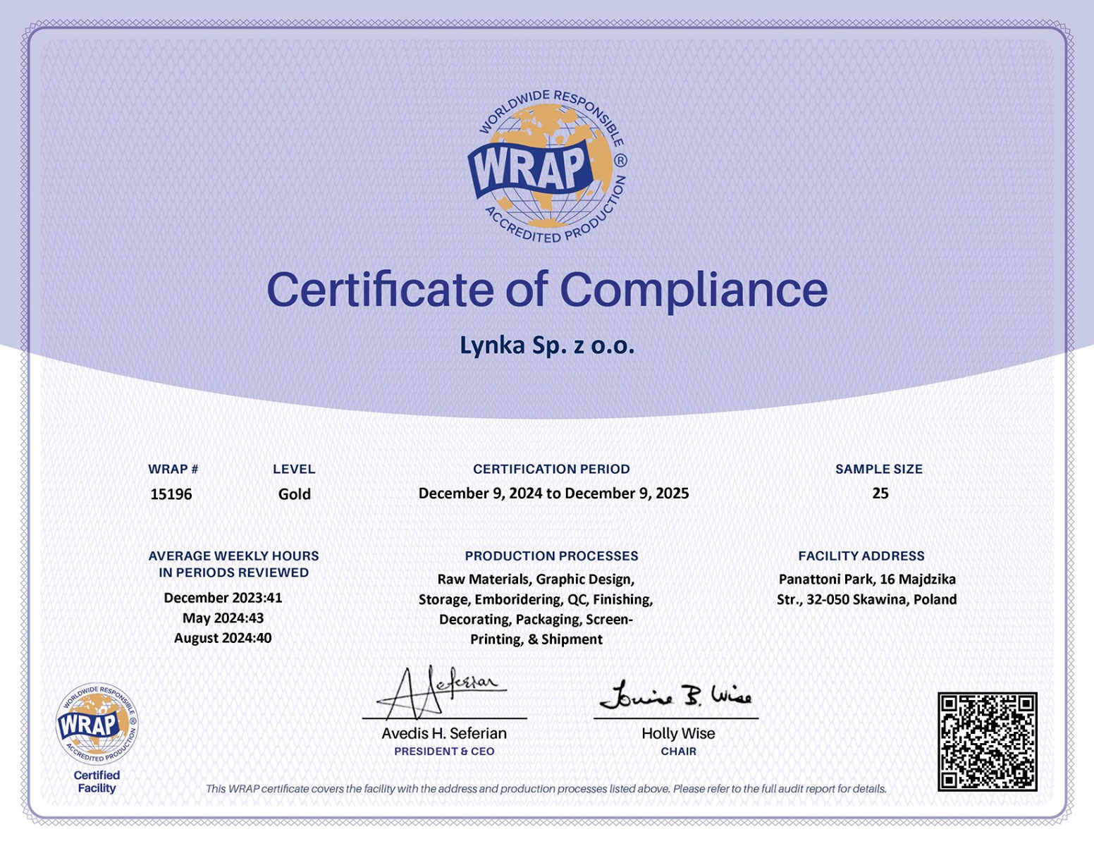 We are pleased to announce that on May 4, 2018, Lynka was re-certified with a Gold Certificate of Compliance by WRAP, the Worldwide Responsible Accredited Production's Certification Board.